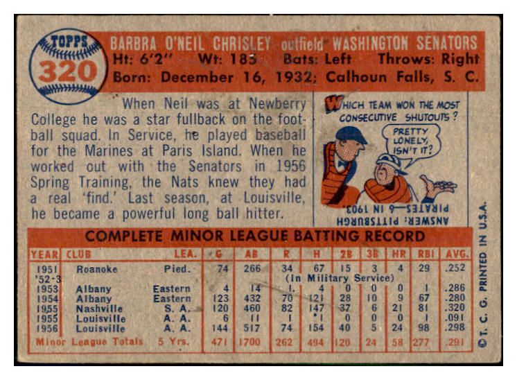 1957 Topps Baseball #320 Neil Chrisley Senators VG-EX 532587
