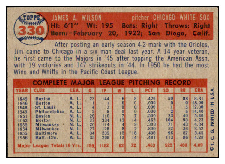 1957 Topps Baseball #330 Jim Wilson White Sox EX-MT 530390