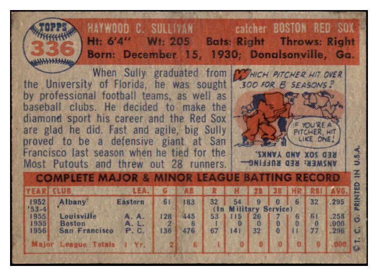 1957 Topps Baseball #336 Haywood Sullivan Red Sox EX-MT 530412