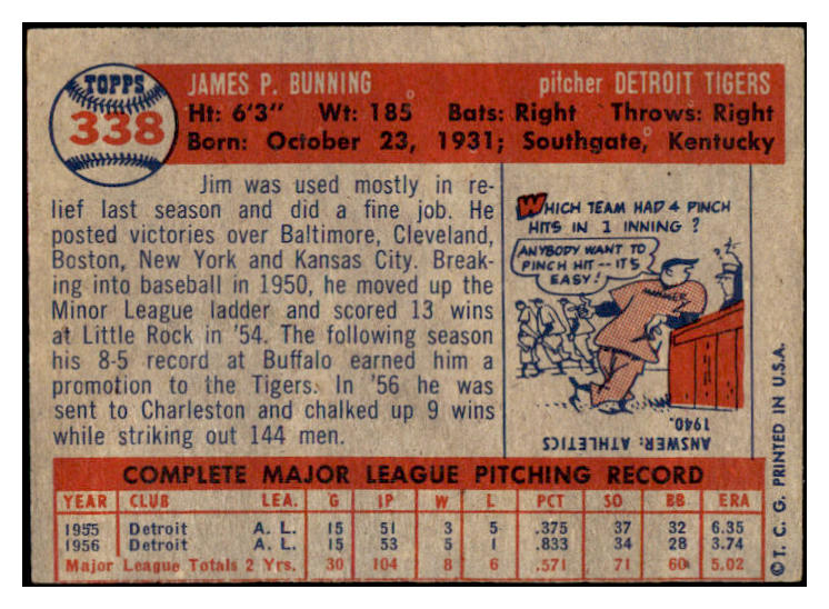 1957 Topps Baseball #338 Jim Bunning Tigers EX 523799