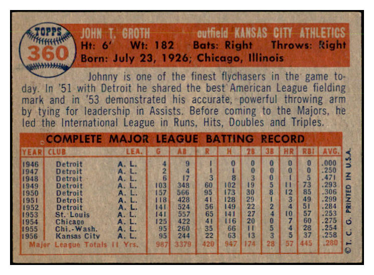 1957 Topps Baseball #360 Johnny Groth A's EX-MT 535507