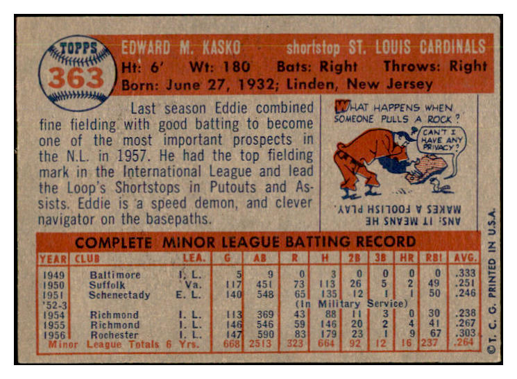 1957 Topps Baseball #363 Eddie Kasko Cardinals EX-MT 535508