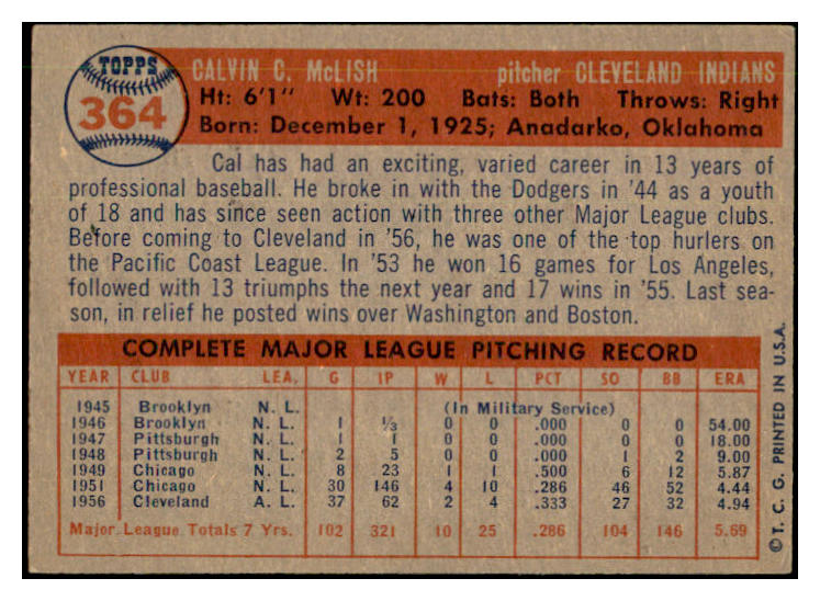 1957 Topps Baseball #364 Cal Mclish Indians EX-MT 535509