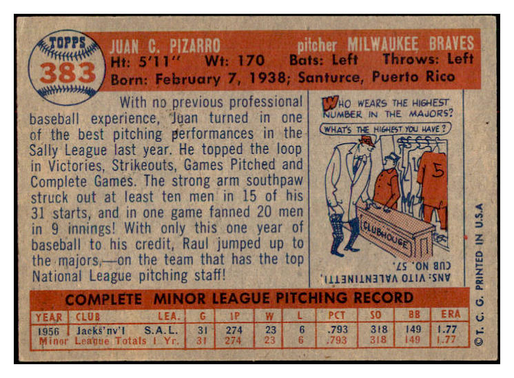 1957 Topps Baseball #383 Juan Pizarro Braves EX-MT 534928
