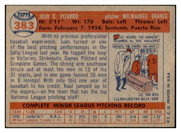 1957 Topps Baseball #383 Juan Pizarro Braves EX-MT 535521