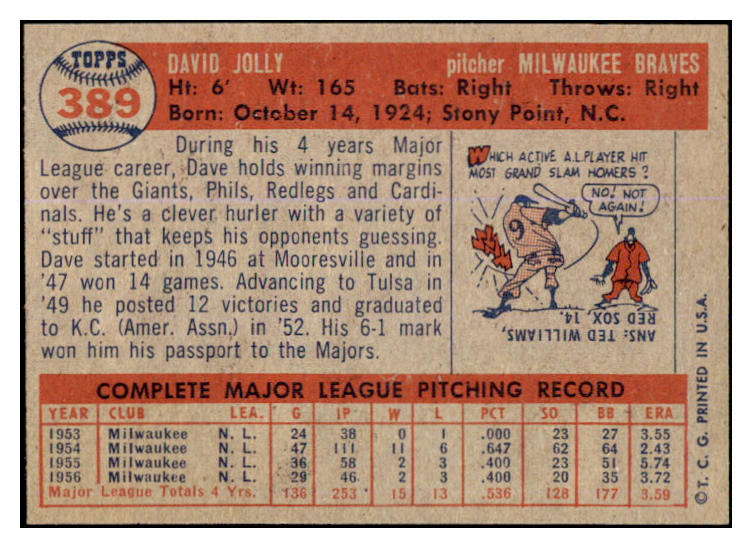 1957 Topps Baseball #389 Dave Jolly Braves EX-MT 527678