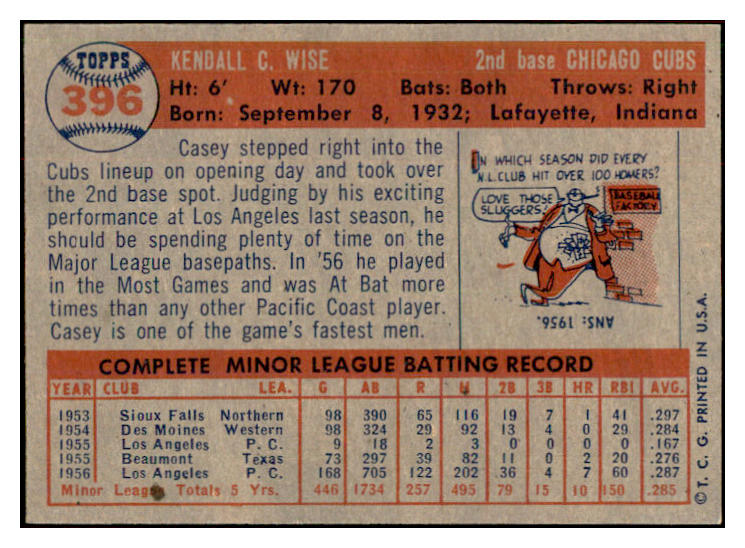1957 Topps Baseball #396 Casey Wise Cubs NR-MT 534914