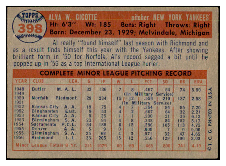 1957 Topps Baseball #398 Al Cicotte Yankees EX-MT 535530