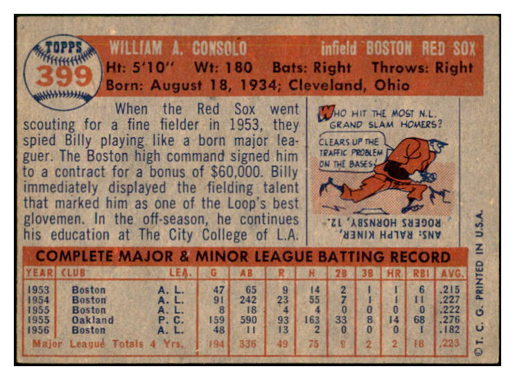 1957 Topps Baseball #399 Billy Consolo Red Sox EX-MT 535531