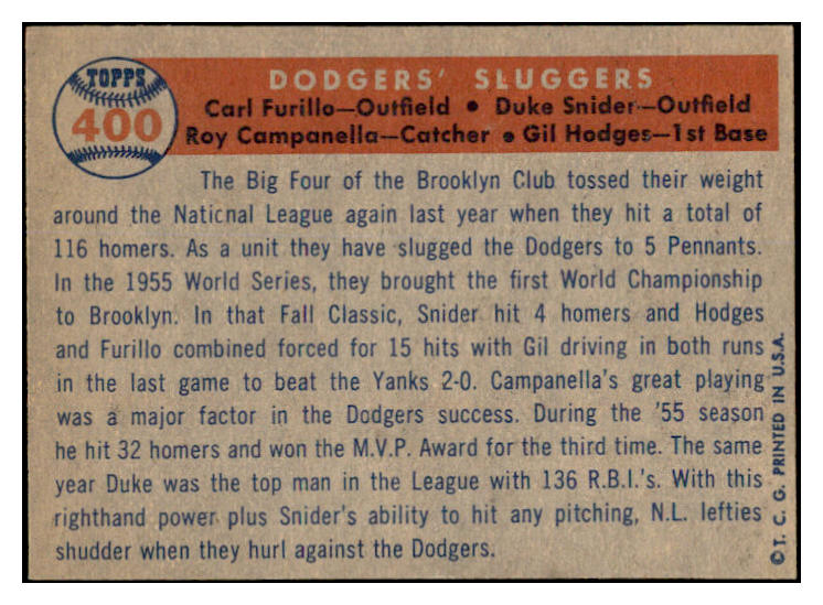 1957 Topps Baseball #400 Roy Campanella Duke Snider Gil Hodges EX 536419