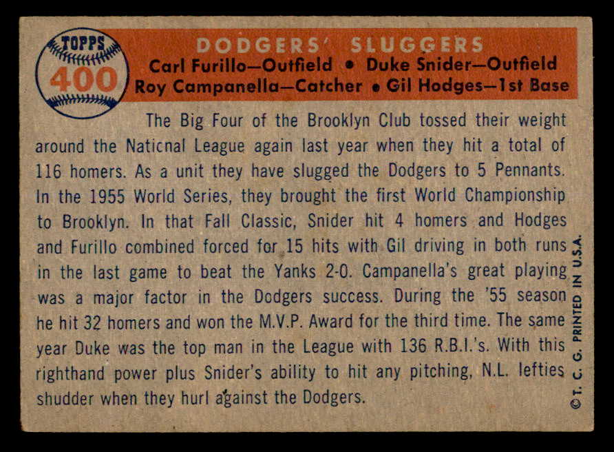 1957 Topps Baseball #400 Roy Campanella Duke Snider Gil Hodges EX 539346