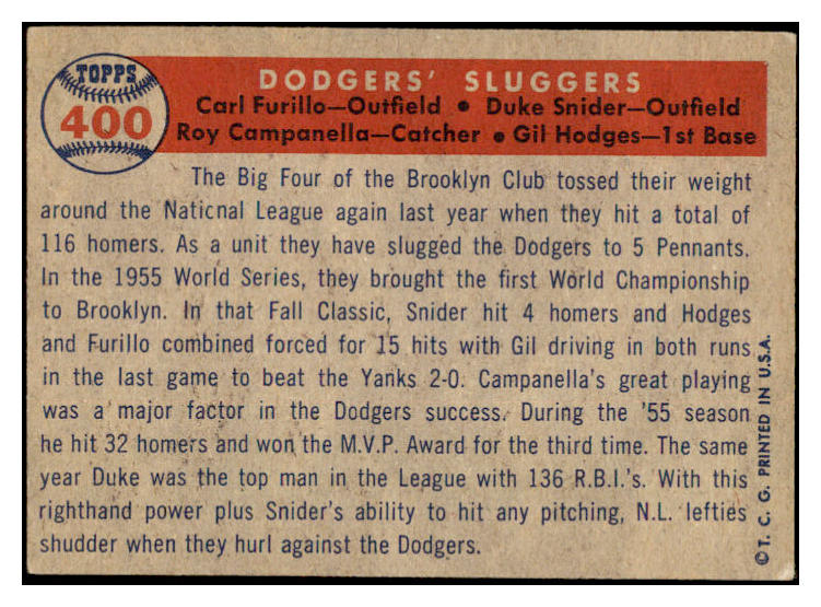 1957 Topps Baseball #400 Roy Campanella Duke Snider Gil Hodges EX-MT 529095