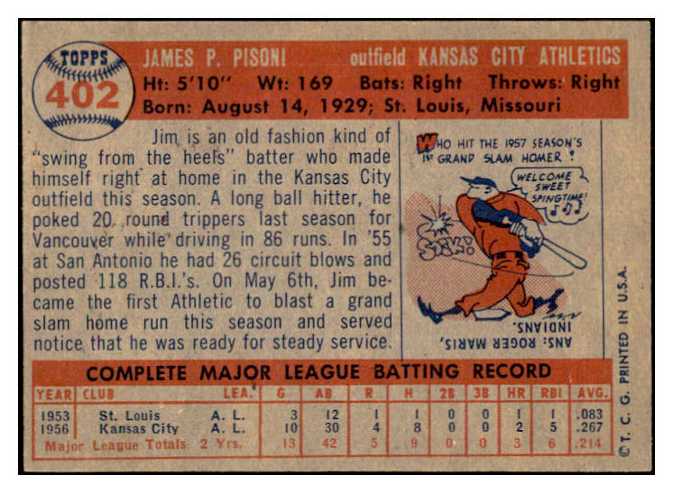 1957 Topps Baseball #402 Jim Pisoni A's EX-MT 534930