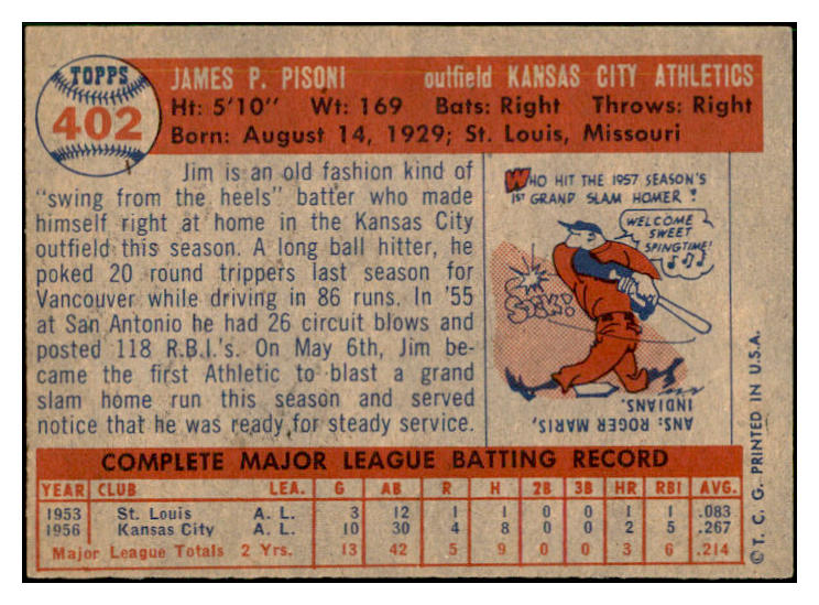 1957 Topps Baseball #402 Jim Pisoni A's EX-MT 535532