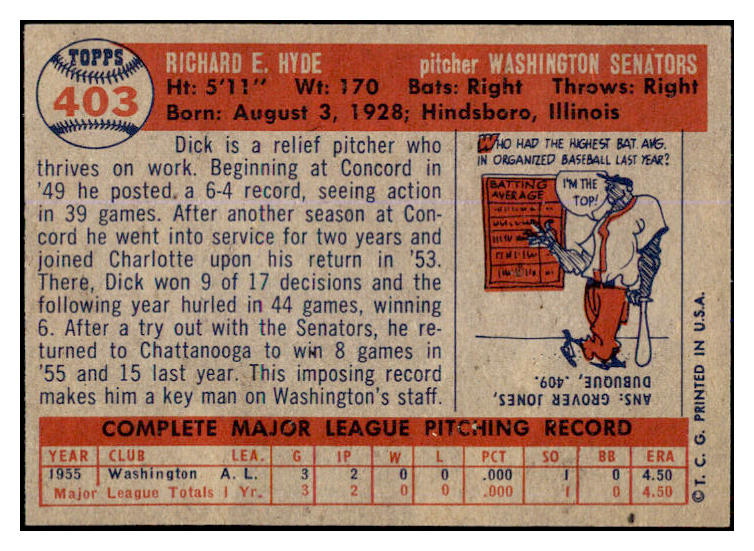 1957 Topps Baseball #403 Dick Hyde Senators EX-MT 527677
