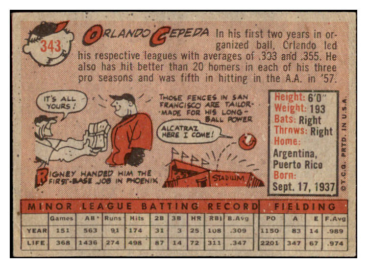 1958 Topps Baseball #343 Orlando Cepeda Giants VG-EX 529022