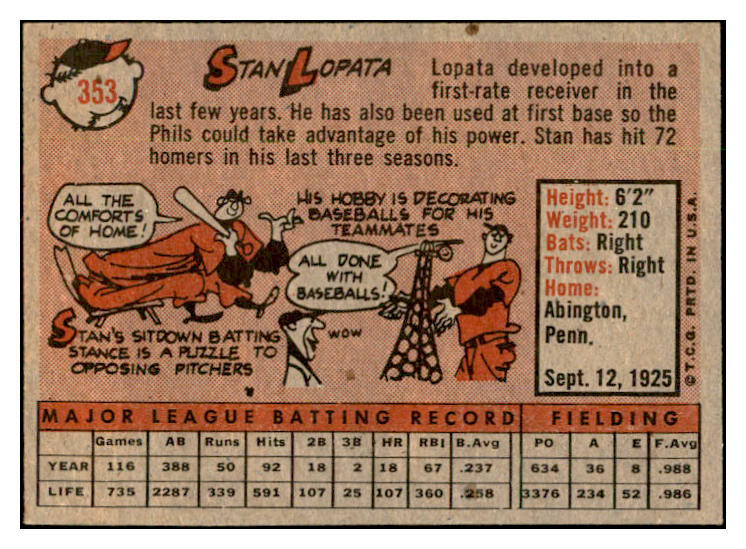 1958 Topps Baseball #353 Stan Lopata Phillies EX-MT 535949