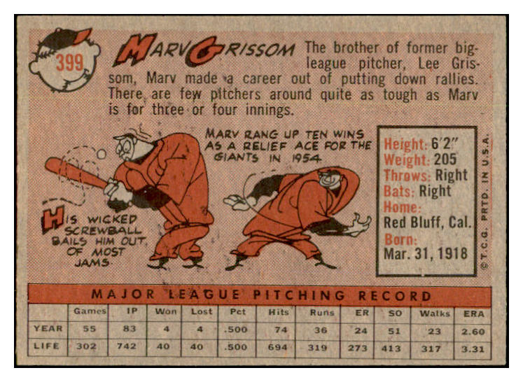 1958 Topps Baseball #399 Marv Grissom Giants EX-MT 536010