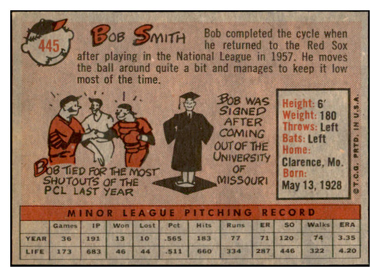 1958 Topps Baseball #445 Bob Smith Red Sox EX-MT 536064