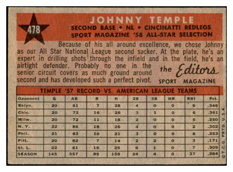 1958 Topps Baseball #478 Johnny Temple A.S. Reds EX-MT 536100