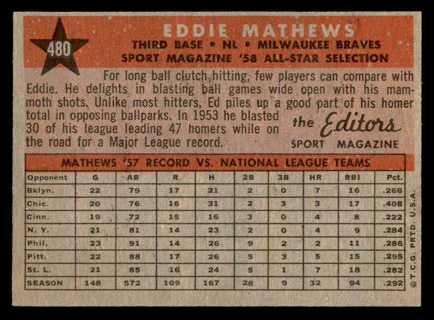 1958 Topps Baseball #480 Eddie Mathews A.S. Braves EX-MT 539331