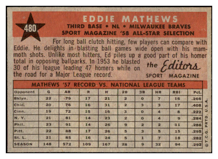 1958 Topps Baseball #480 Eddie Mathews A.S. Braves NR-MT 528985