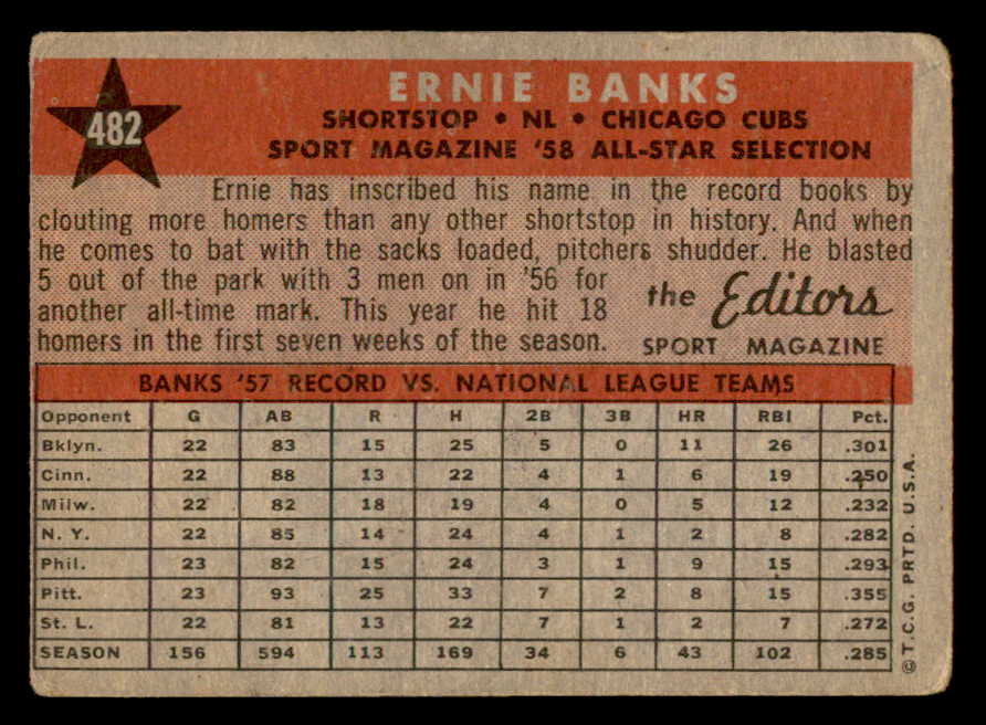 1958 Topps Baseball #482 Ernie Banks A.S. Cubs Poor 540125