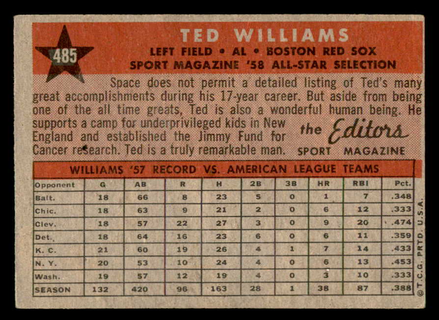 1958 Topps Baseball #485 Ted Williams A.S. Red Sox EX 538951