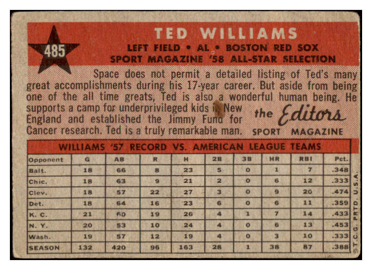 1958 Topps Baseball #485 Ted Williams A.S. Red Sox VG 529088