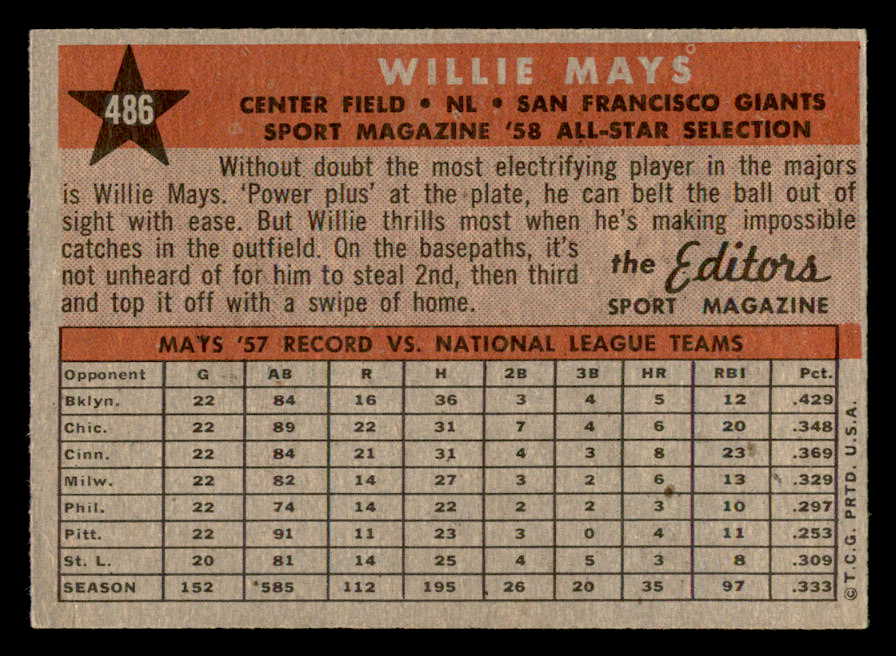 1958 Topps Baseball #486 Willie Mays A.S. Giants VG-EX 538841