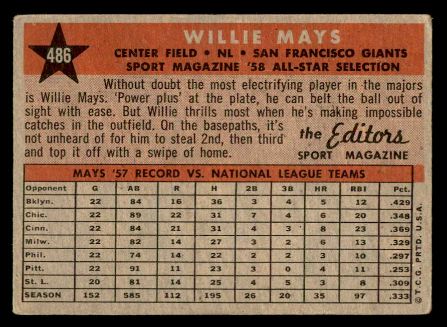 1958 Topps Baseball #486 Willie Mays A.S. Giants VG-EX 538890