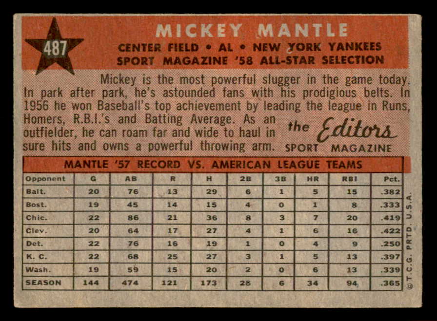 1958 Topps Baseball #487 Mickey Mantle A.S. Yankees VG-EX 538895