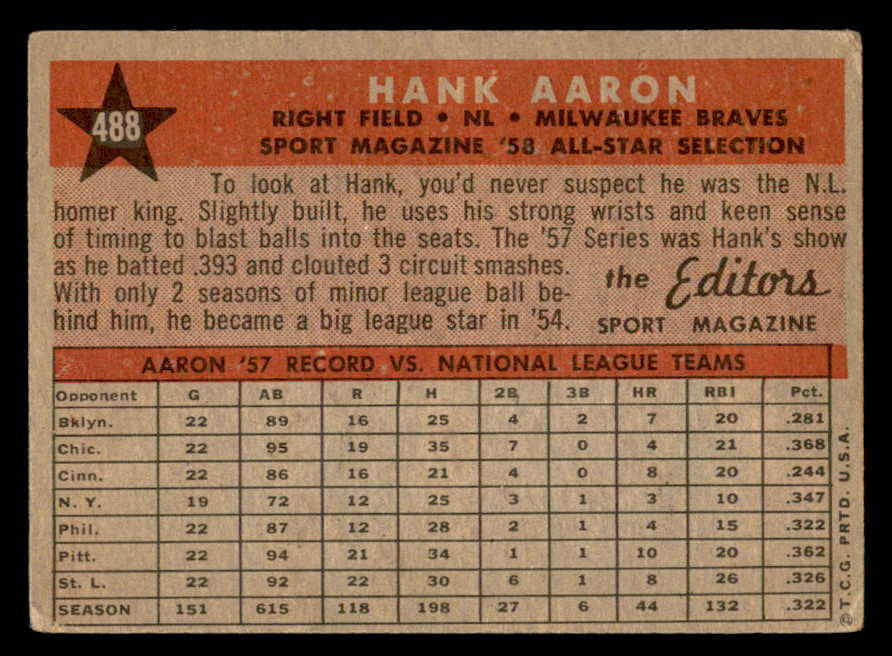1958 Topps Baseball #488 Hank Aaron A.S. Braves VG 540132