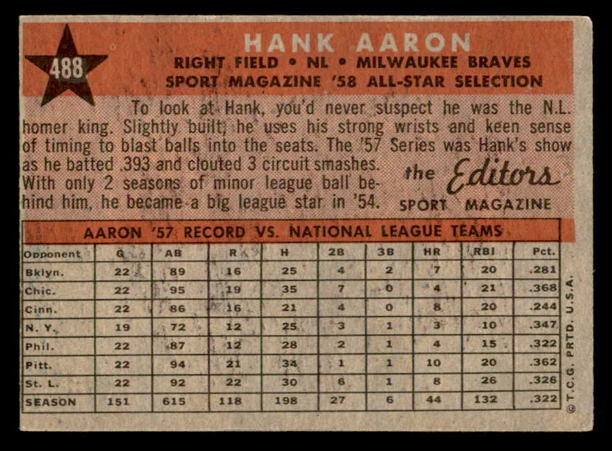 1958 Topps Baseball #488 Hank Aaron A.S. Braves VG-EX 538822