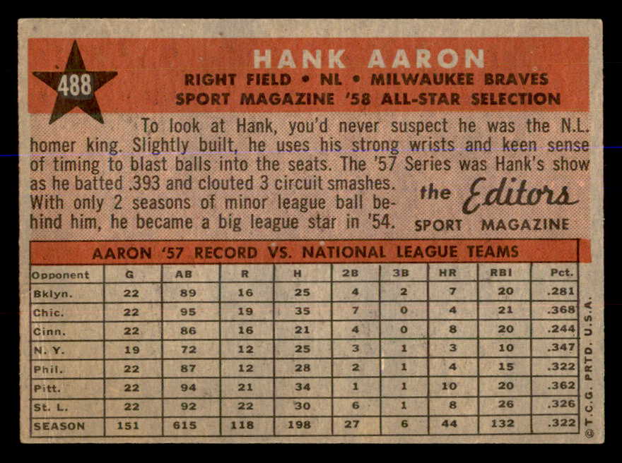 1958 Topps Baseball #488 Hank Aaron A.S. Braves VG-EX 547832