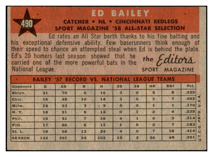 1958 Topps Baseball #490 Ed Bailey A.S. Reds EX-MT 536103