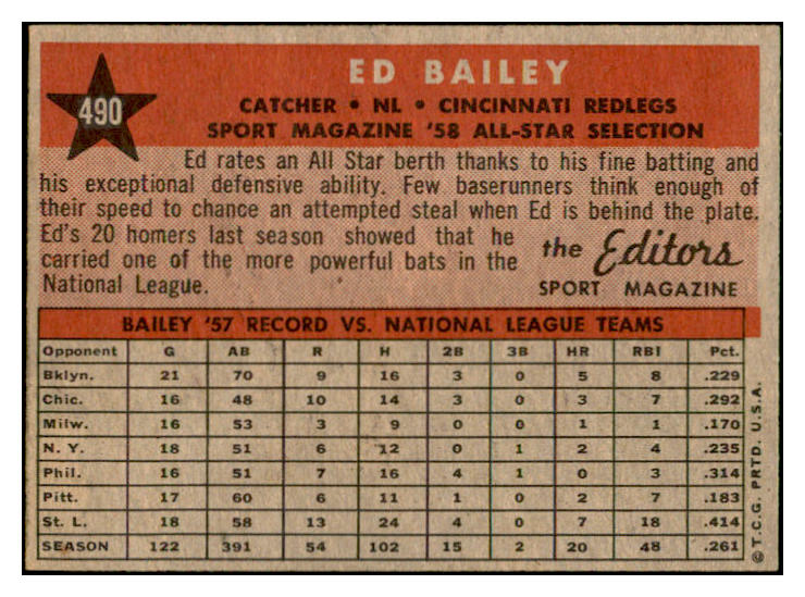 1958 Topps Baseball #490 Ed Bailey A.S. Reds EX-MT 536104