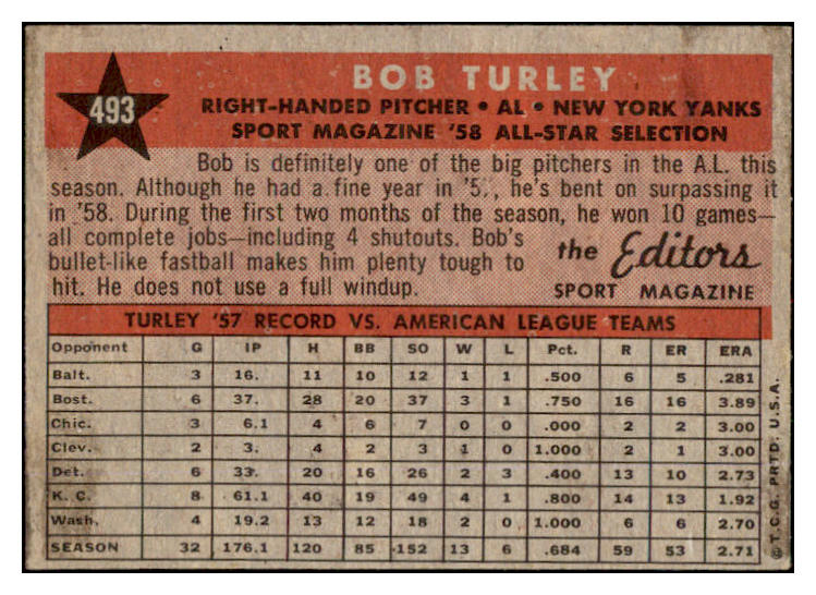 1958 Topps Baseball #493 Bob Turley A.S. Yankees EX-MT 530570