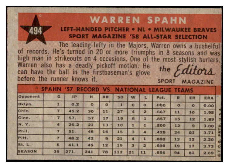 1958 Topps Baseball #494 Warren Spahn A.S. Braves EX-MT 529078