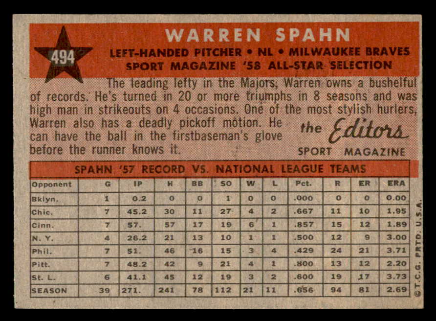 1958 Topps Baseball #494 Warren Spahn A.S. Braves EX-MT 538958