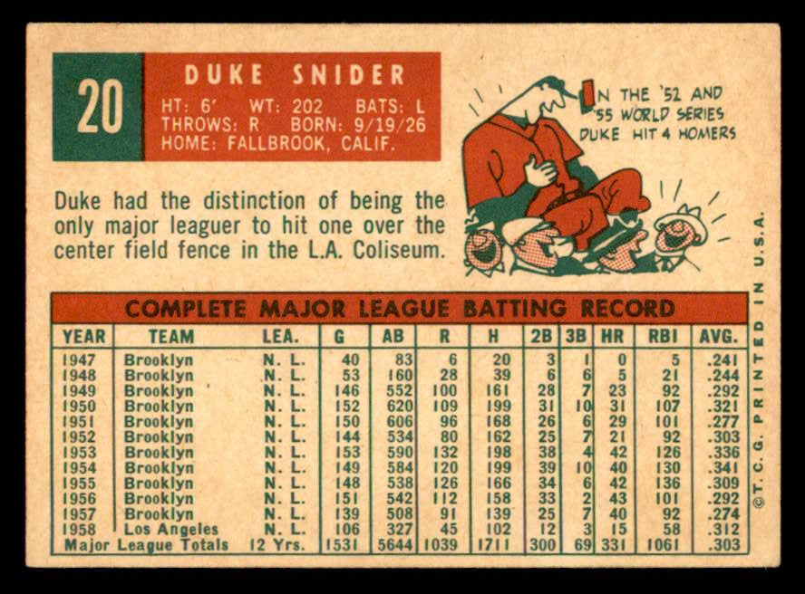 1959 Topps Baseball #020 Duke Snider Dodgers EX-MT 538802