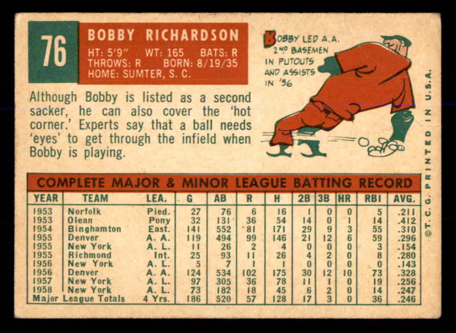 1959 Topps Baseball #076 Bobby Richardson Yankees VG 547830