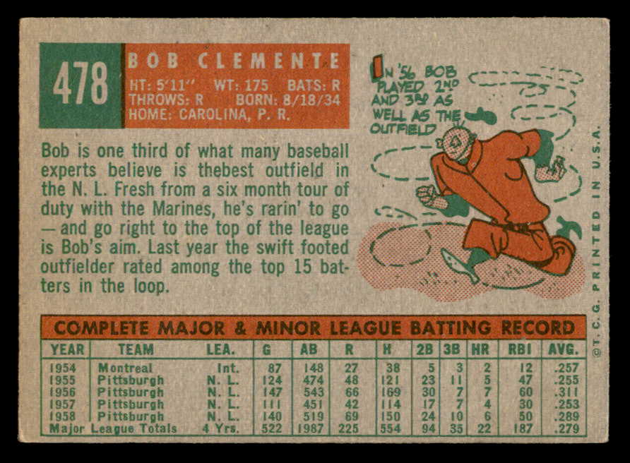 1959 Topps Baseball #478 Roberto Clemente Pirates VG-EX 545655