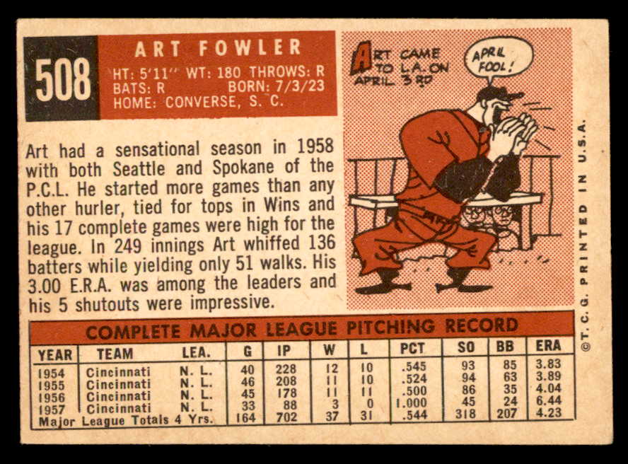 1959 Topps Baseball #508 Art Fowler Dodgers EX 547015