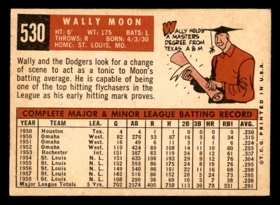 1959 Topps Baseball #530 Wally Moon Dodgers EX 547035