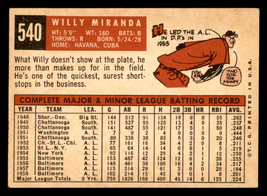 1959 Topps Baseball #540 Willie Miranda Orioles EX 547040