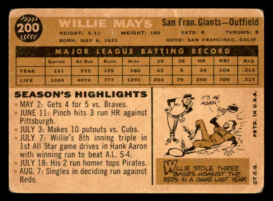1960 Topps Baseball #200 Willie Mays Giants Poor 540235