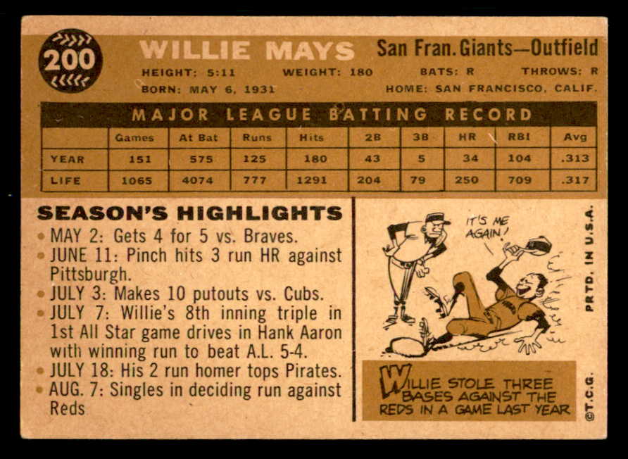 1960 Topps Baseball #200 Willie Mays Giants VG-EX 539404