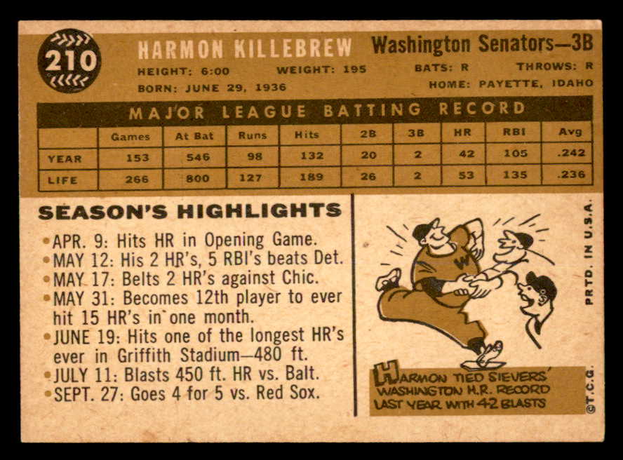 1960 Topps Baseball #210 Harmon Killebrew Senators EX-MT 539438