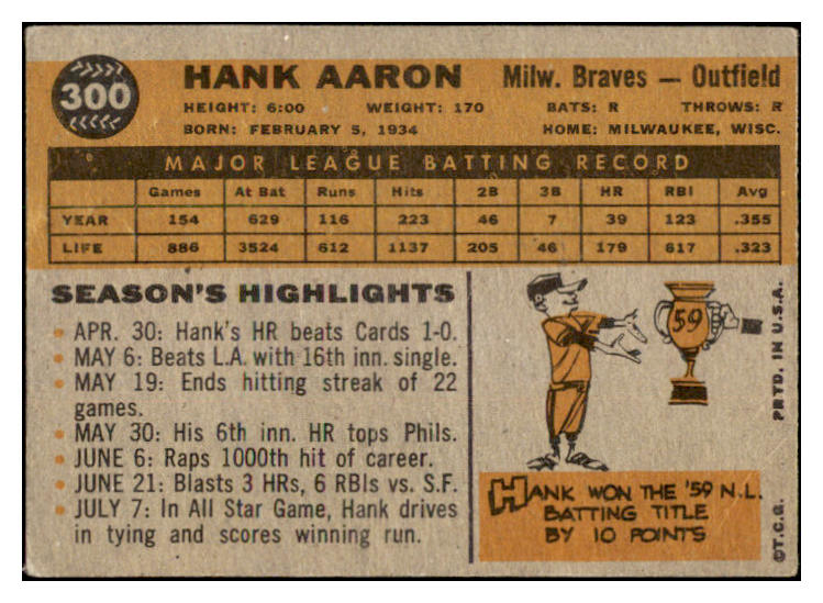1960 Topps Baseball #300 Hank Aaron Braves GD-VG 529116